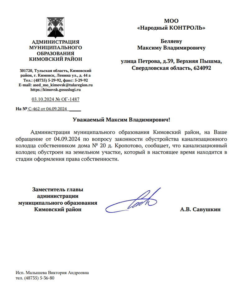 В начале сентября было получено обращение из деревни Кропотово. Житель деревни выразил обеспокоенность по поводу того, что собственник жилья незаконно выкопал канализационный колодец на муниципальной территории, находящейся за его забором.