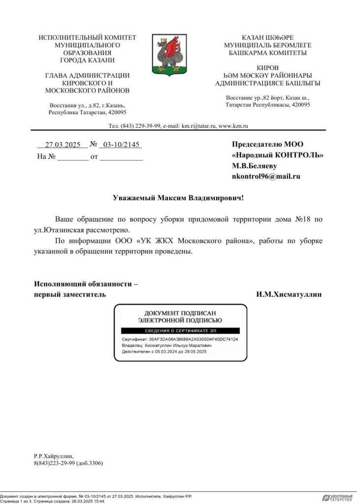 Благодарим неравнодушных граждан за Ваши обращения. Если Вы не согласны с данным ответом Администрации Кировского и Московского районов города Казани, пожалуйста, сообщите об этом нам (желательно с фото/видео доказательствами выполнения работы в неполном объеме или ее невыполнении).