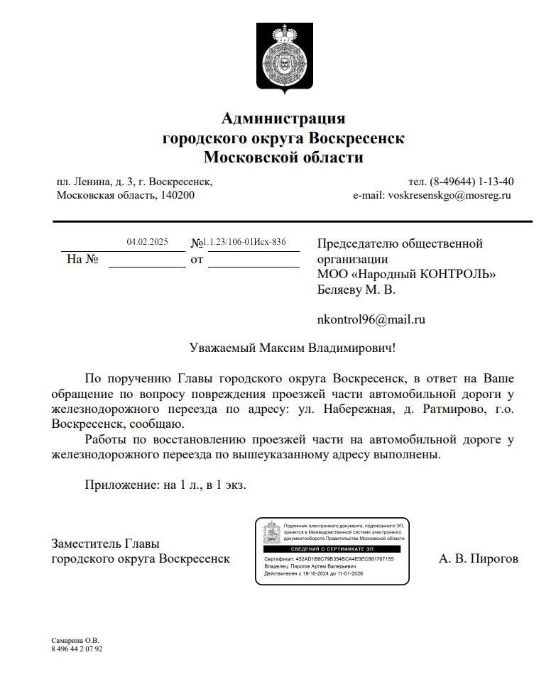 В ответ на обращение администрация округа сообщила, что по поручению главы городского округа Воскресенск были организованы работы по восстановлению проезжей части. На данный момент ремонтные работы завершены, и дорожное покрытие у железнодорожного переезда приведено в нормативное состояние. К ответу была приложена фотография, подтверждающая результаты проведенных работ.