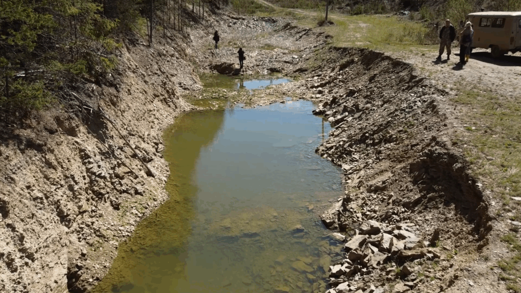 В-третьих, для строительства глэмпингов возле воды была проложена дополнительная дорога через реку. Предположительно именно для строительства этой дороги и был вырыт карьер, который жители обнаружили полтора года назад. Выработка производилась экскаватором, и выработанная порода большегрузами перевозилась в поселок. На сегодняшний день добыча приостановлена, а карьер так и стоит ничем не огороженный. Жители предполагают, что разрешений на выработку у предпринимателя нет.