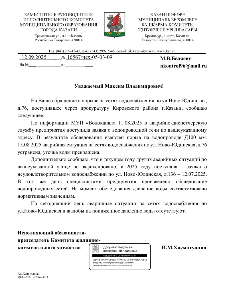 В ответе, поступившем от Исполнительного комитета города, сообщается, что авария была устранена 15 августа 2025 года.