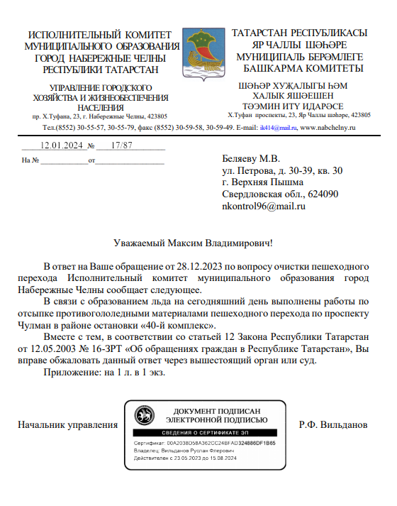 Публикуем ранее поступивший ответ по обращению жителей города Набережные Челны республики Татарстан по вопросу очистки пешеходного перехода по проспекту Чулман.