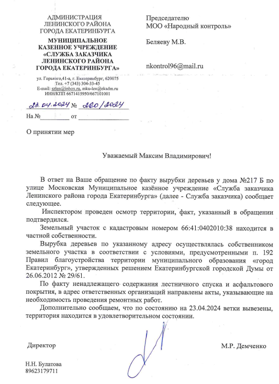 В ответ на Ваше обращение по факту вырубки деревьев у дома №217 Б по улице Московская Муниципальное казённое учреждение «Служба заказчика Ленинского района города Екатеринбурга» (далее — Служба заказчика) сообщает следующее.