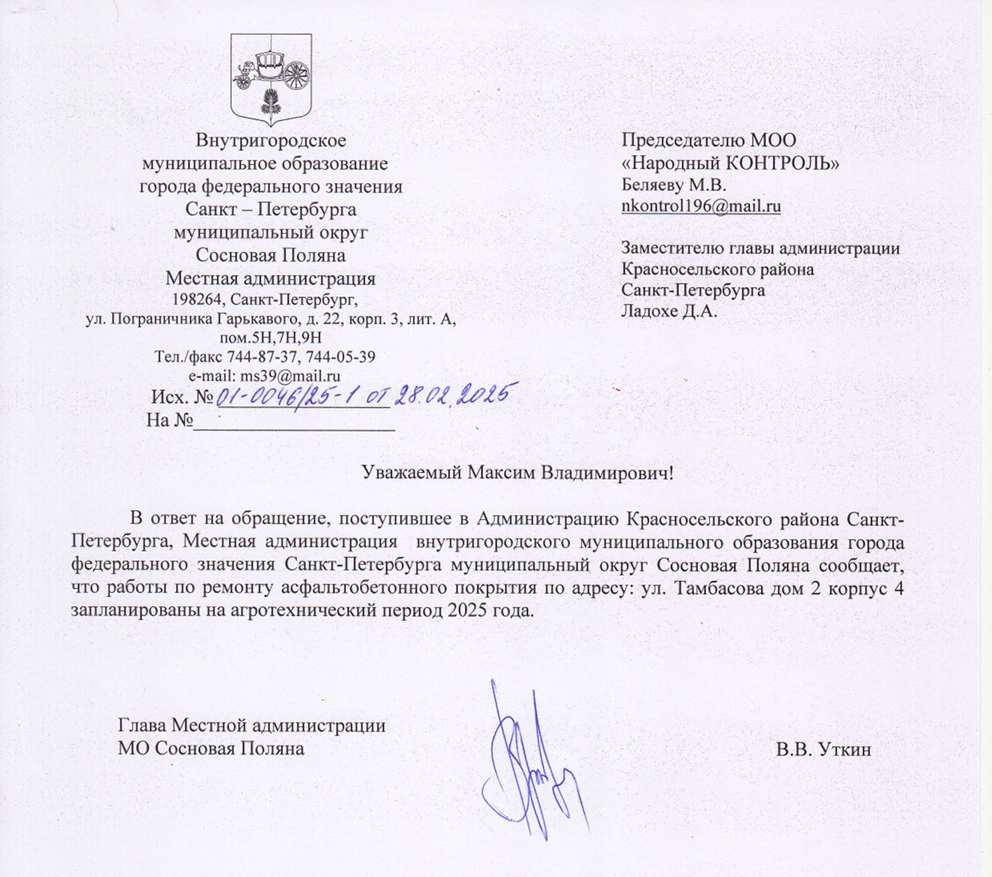В ответ на обращение местная администрация Красносельского района сообщила, что работы по ремонту асфальтобетонного покрытия на указанном участке запланированы на агротехнический период 2025 года.