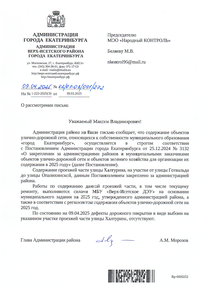 В ответе администрации района говорится, что содержание объектов улично-дорожной сети осуществляется в строгом соответствии с постановлением о закреплении объектов за муниципальными заказчиками на 2025 год. Работы по ремонту этой части дороги выполняются МБУ «Верх-Исетское ДЭУ» на основании утвержденного муниципального задания. По состоянию на 9 апреля 2025 года, дефекты дорожного покрытия на данном участке отсутствуют.