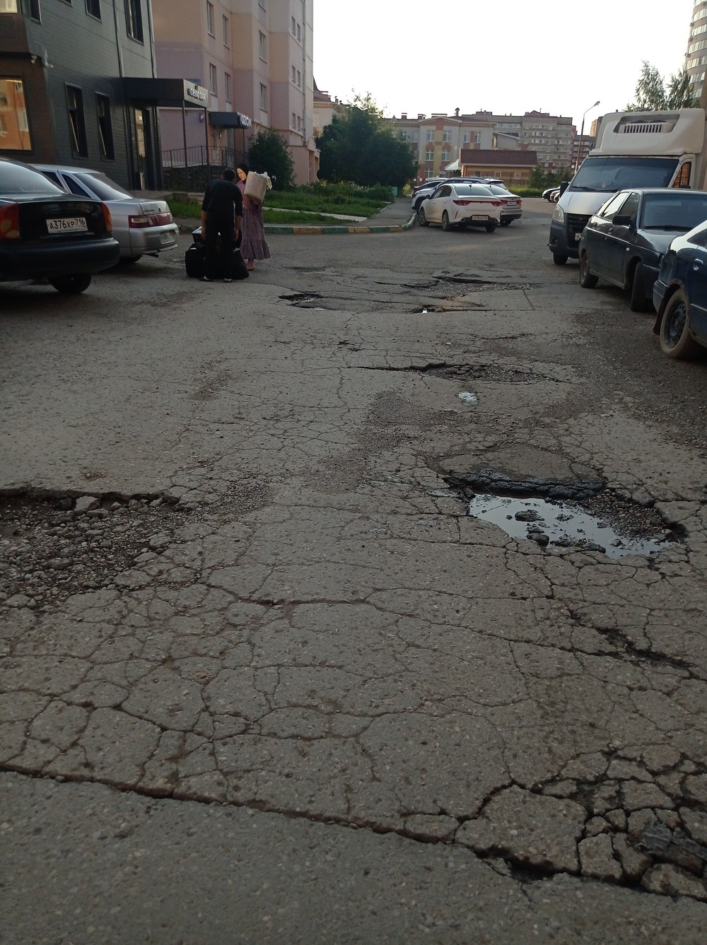 г. Альметьевск, Татарстан, ул. Ленина, д. 195. За домом, между домами — множество ям и выбоин на дороге.