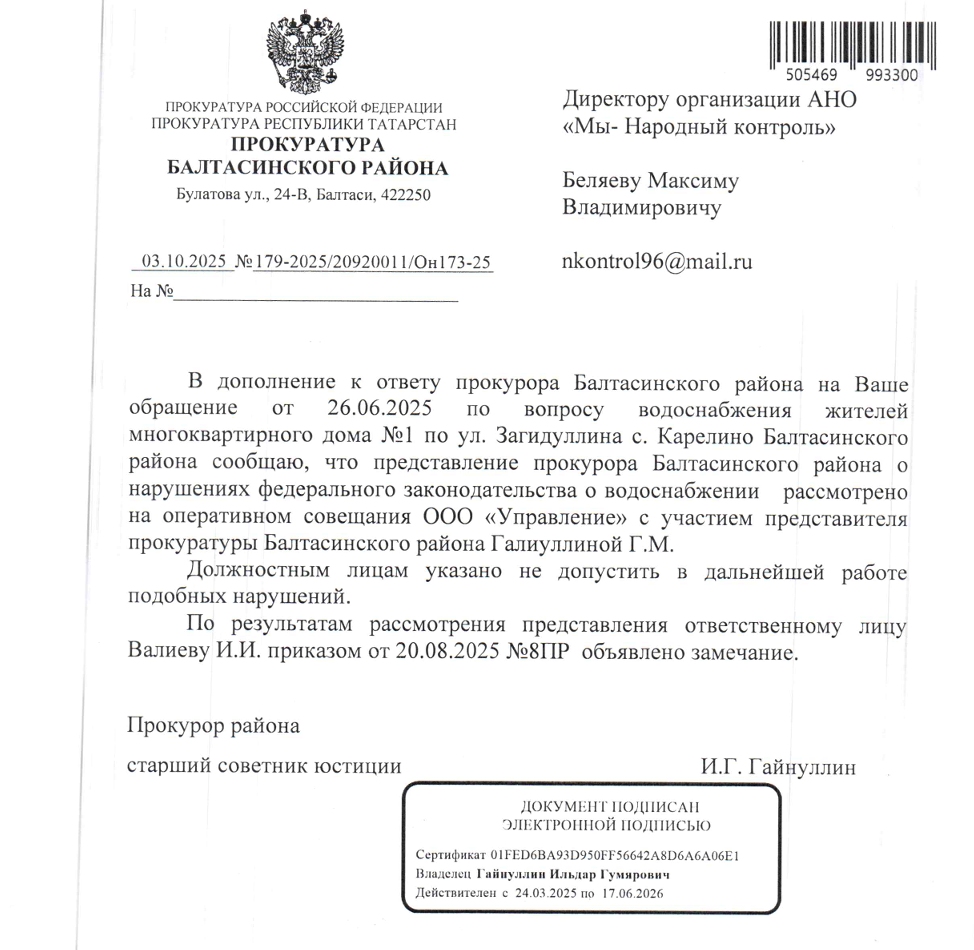 В конце июня этого года жильцы дома №1 по улице Загидуллина в селе Карелино обратились с жалобой на постоянные перебои с водоснабжением. По их словам, вода в кранах отсутствовала большую часть дня и появлялась только ночью, что нарушало санитарные нормы и создавало серьезные бытовые трудности.
