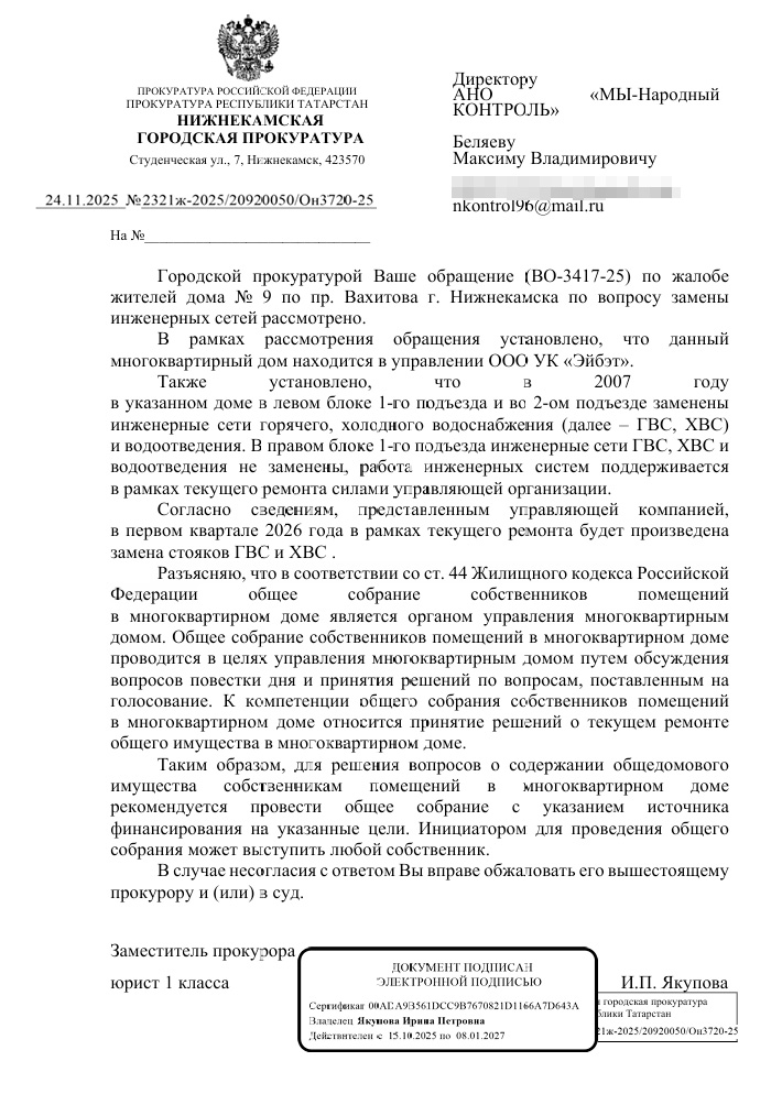 Управляющая компания сообщила о планах замены сетей на первый квартал 2026 года. Однако прокуратура указала, что решение вопросов текущего ремонта относится к компетенции общего собрания собственников, предложив жильцам самостоятельно инициировать собрание для определения источников финансирования.
