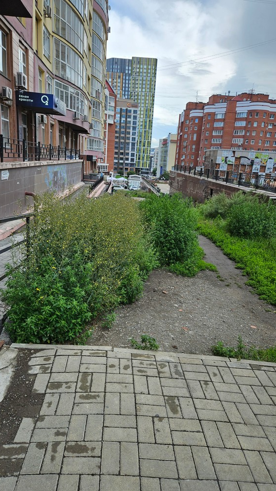 Запущенный газон вдоль пешеходной эспланады в центре Екатеринбурга