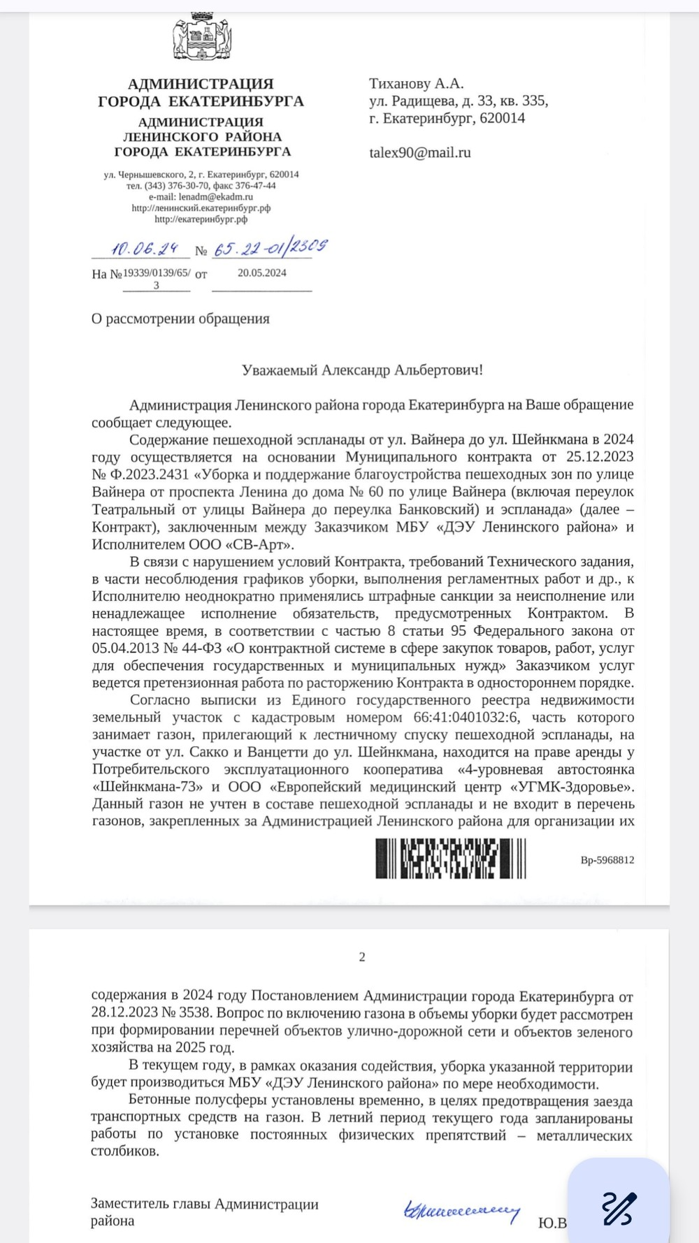 В июле месяце 2024 г. я обратился в Администрацию Ленинского района г. Екатеринбурга с запросом о наведении порядка на газоне, трава не кошена с мая месяца и сорняки в человеческий рост.
