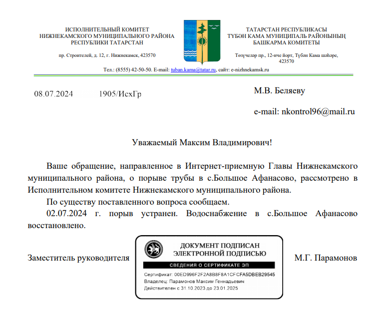 Ответ Исполнительного комитета Нижнекамского муниципального района: