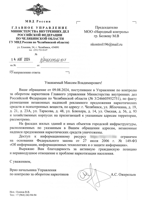 Ваше обращение от 09.08.2024, поступившее в Управление по контролю за оборотом наркотиков Главного управления Министерства внутренних дел Российской Федерации по Челябинской области (№ 3/246605952751), по факту размещения незаконных надписей рекламного предложения наркотических средств и психотропных веществ, по адресу: г. Челябинск, ул. Яблочкина, д. 19. д. 21, д. 23А, ул. Тарасова, д. 48, ул. Блюхера, д. 14, ул. Омская, д. 56, д. 93. и хозяйственных корпусах на прилегающей к указанным адресам территории, рассмотрено.