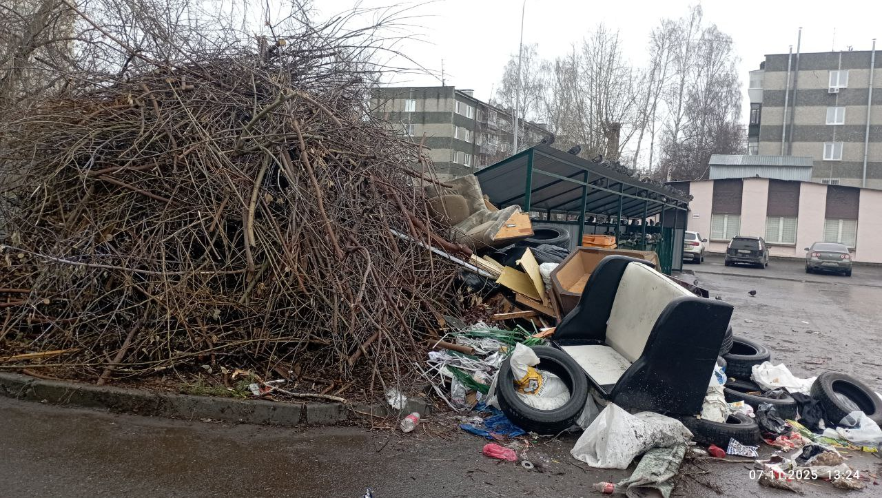 7 ноября 2025 года, время 13:54. Долгое время снова не вывозится гора веток и автошин, собранных УК РЭМП Ж/д района на мусорной площадке с торца дома по адресу: ул. Расточная, 41. Мало того, что нарушены санитарные нормы, так ещё и создаётся пожароопасная ситуация!