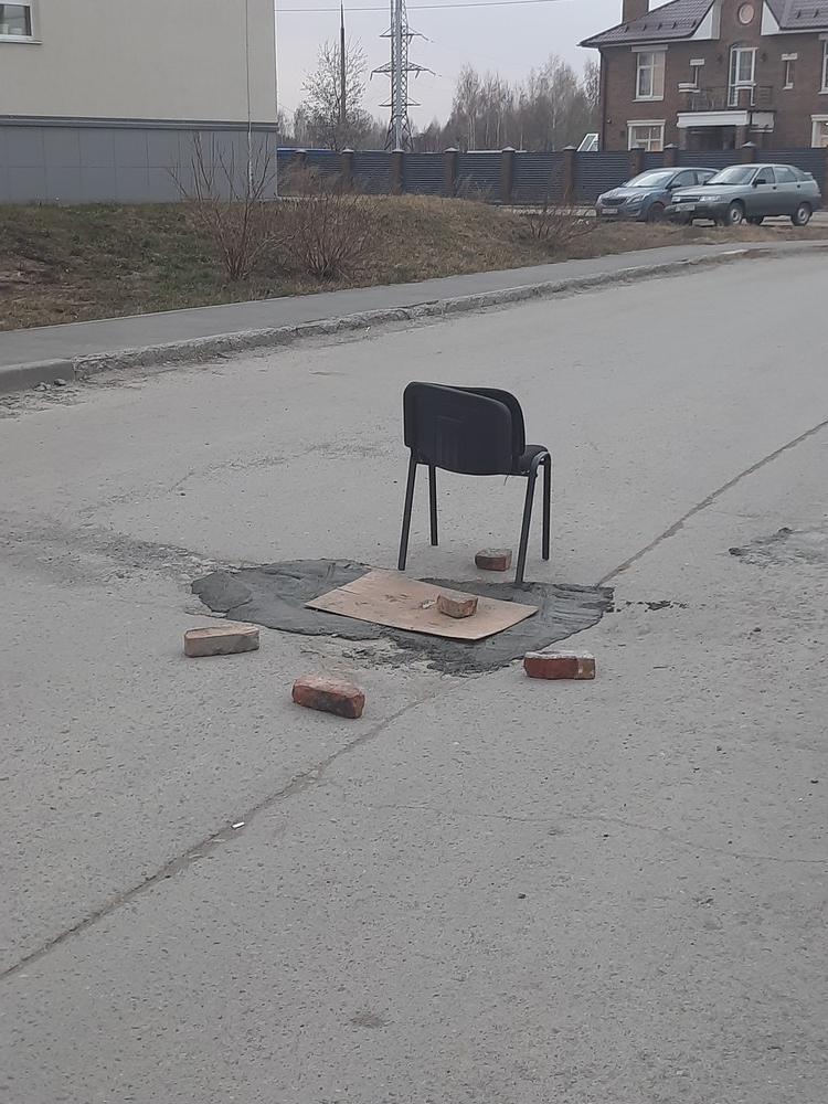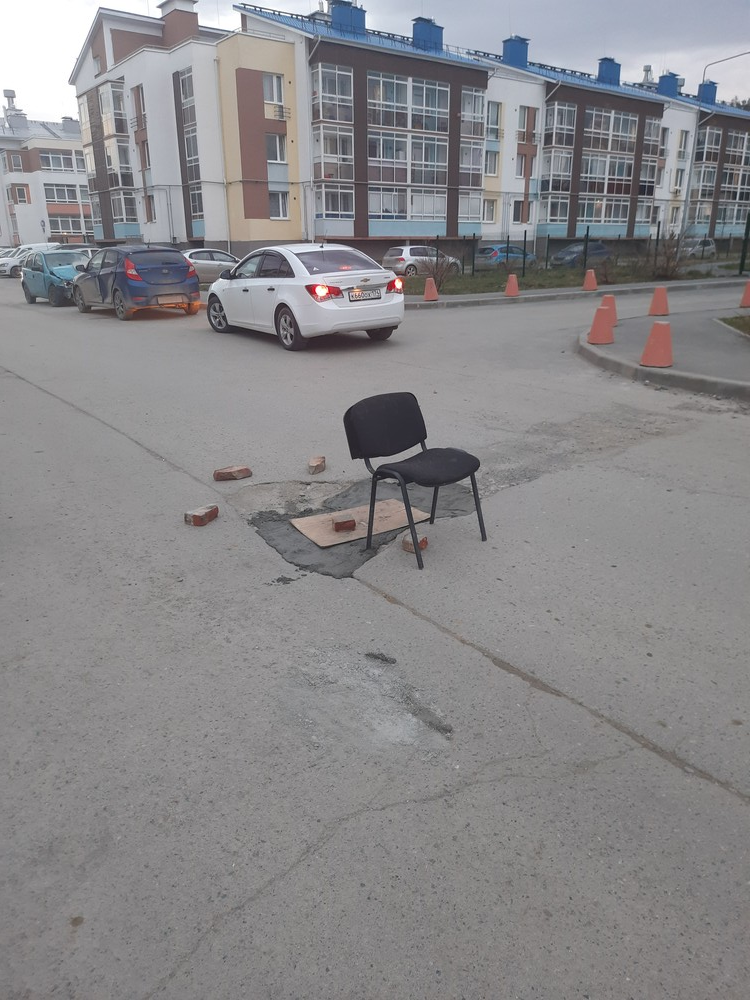 Помогите решить проблему. Большая яма на дороге, жители сами пытаются ремонтировать уже не первый год. Город Екатеринбург, улица Майская, 16.