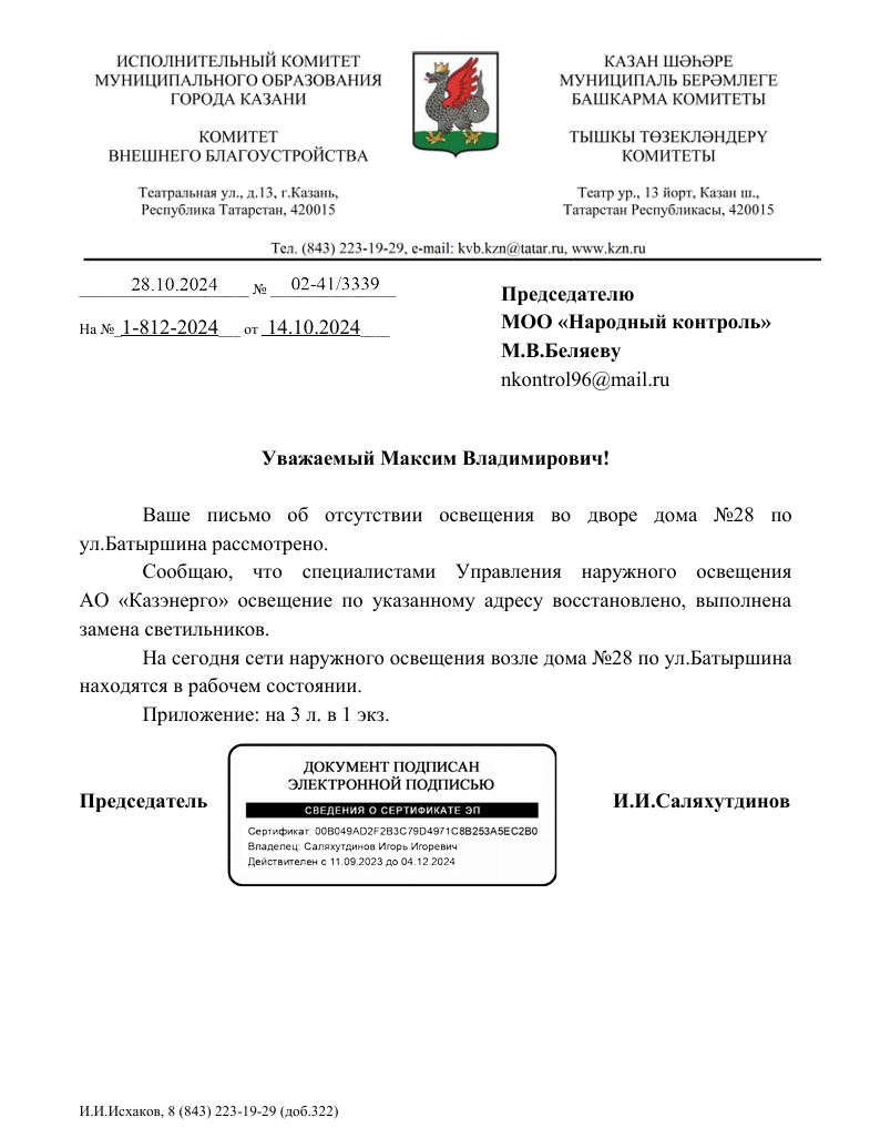 Ответ сообщил, что специалисты Управления наружного освещения АО «Казэнерго» провели необходимые работы по восстановлению освещения. Были заменены светильники, и сейчас сети наружного освещения возле дома находятся в рабочем состоянии. Жители могут вновь пользоваться освещением во дворе, что улучшит безопасность и комфорт в их районе.