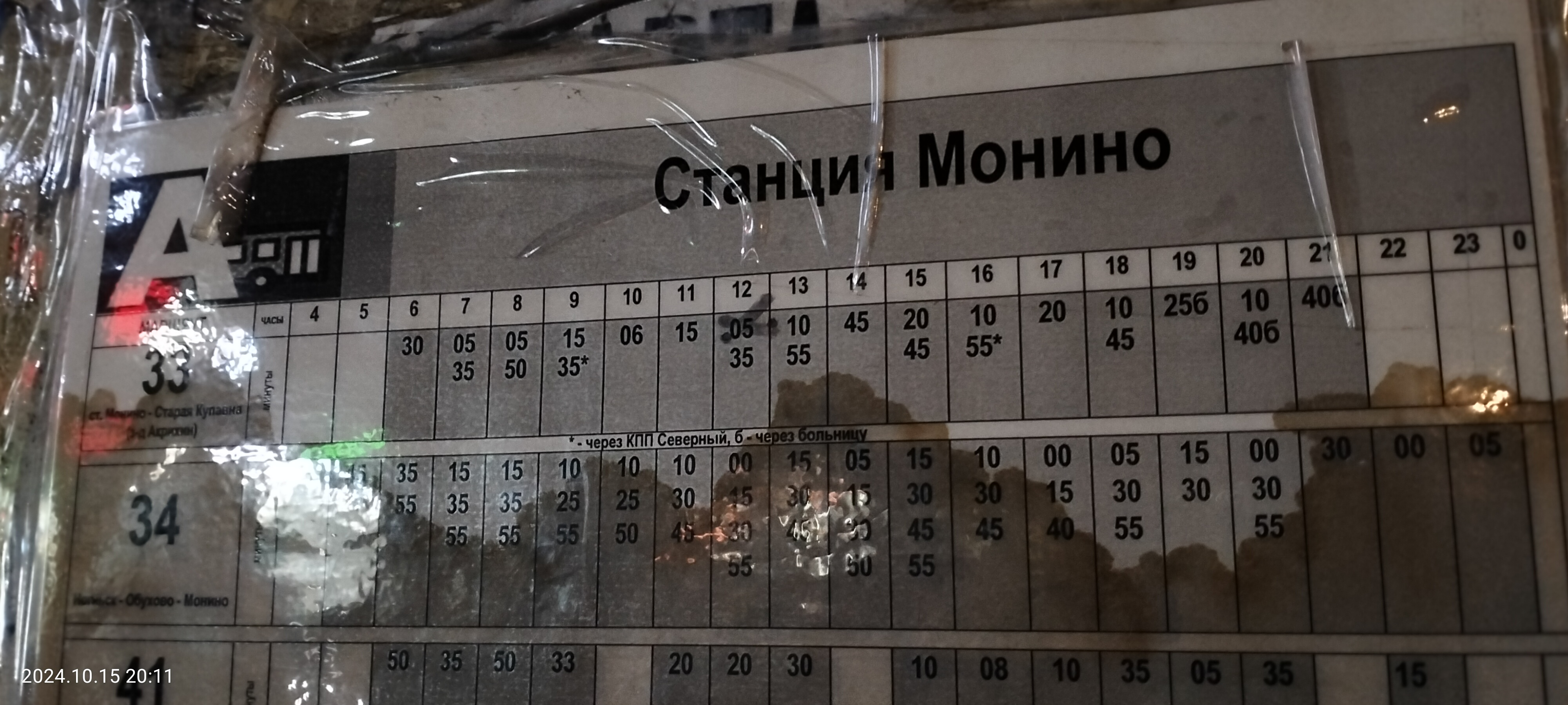 Станция Монино, Щелковский городской округ, отсутствует остановочный павильон. Более 15 лет отсутствуют остановочные павильоны на станции Монино, это пересадочный пункт, и ни одного совершенно нет остановочного павильона. Жители вынуждены постоянно стоять под дождем и в любую погоду. Пенсионеры стоят, ждут автобусы и маршрутки, и даже присесть на лавочку негде. Бардак полнейший: круг заволокли машинами такси, и автобусы практически втискиваются, постоянно выстраиваются очереди в час пик, хотя недавно сделали какую-то странную разметку.