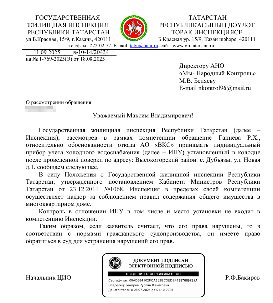 В августе житель села Дубъязы Республики Татарстан столкнулся с отказом коммунальной службы принимать показания счётчика воды, установленного в колодце частного дома. После поверки прибора учёта ХВС, подтвердившей его исправность, сотрудники АО «Высокогорские коммунальные сети» отказались снимать показания, сославшись на потенциальную опасность спуска в колодец, хотя заявитель предоставил видеофиксацию исправного состояния счётчика и отсутствия дефектов.
