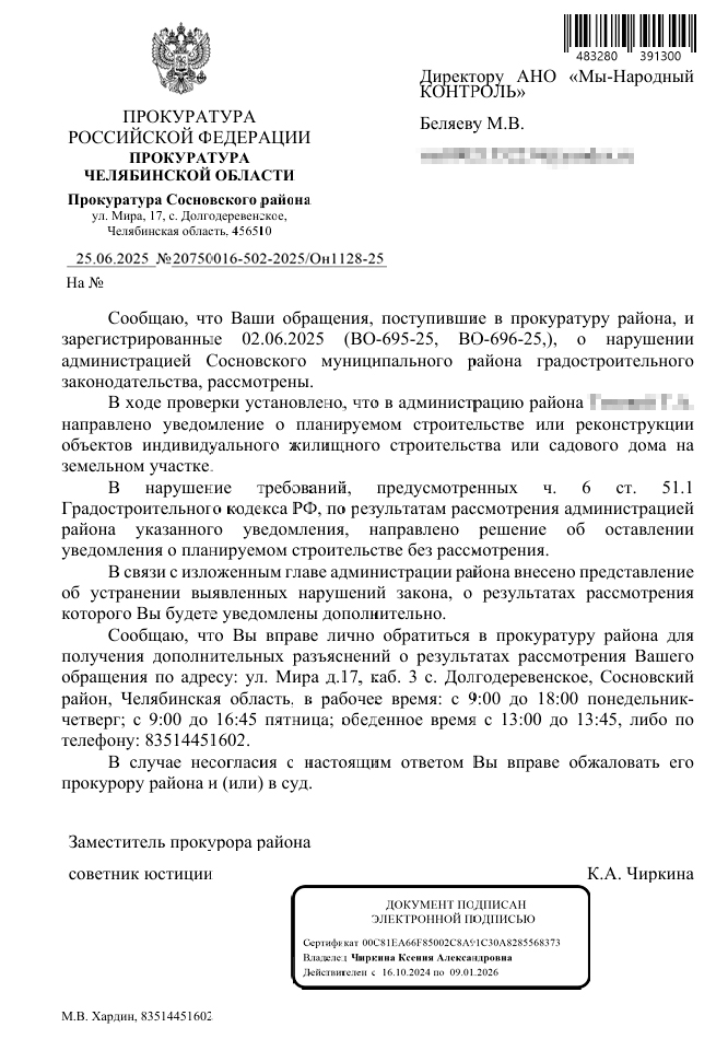 В ходе проверки было установлено, что решение об оставлении уведомления без рассмотрения действительно принято с нарушением требований статьи 51.1 Градостроительного кодекса. В связи с этим в адрес главы администрации района было внесено представление об устранении выявленных нарушений. Заявительница будет дополнительно проинформирована о результатах рассмотрения представления.
